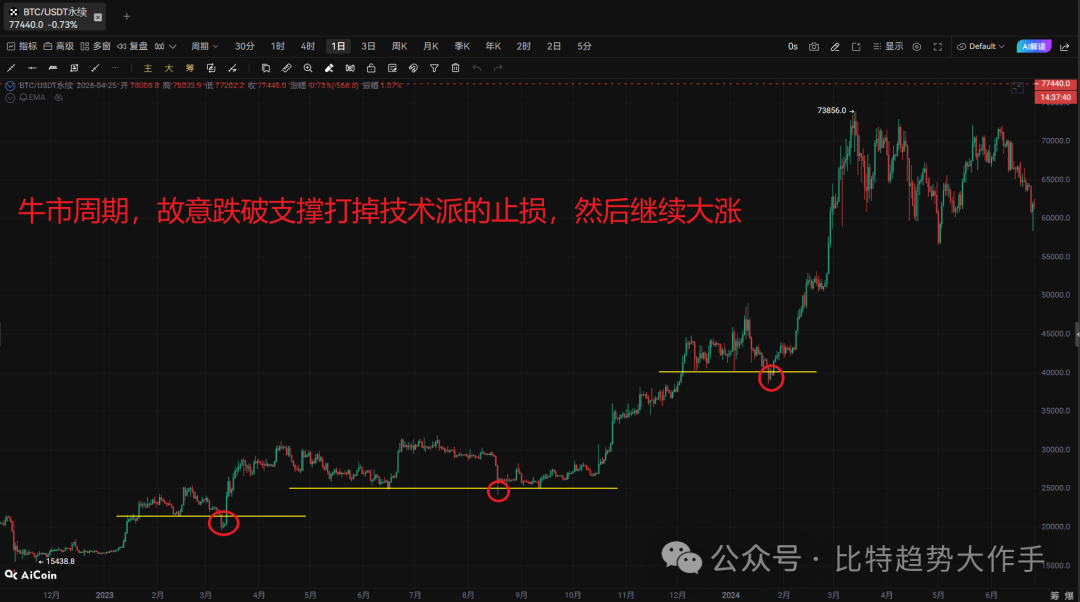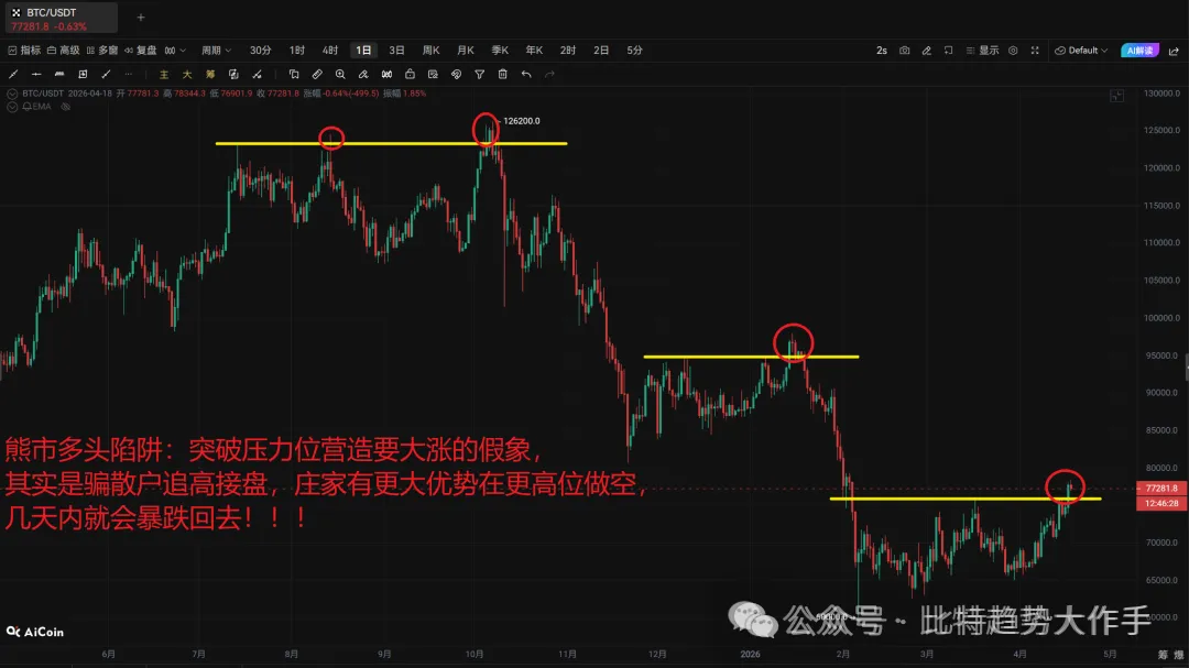 别再对着 K 线喊 “牛市来了” 了!当你看到价格突破压力位、K 线拉出大阳线,以为终于要开启新一轮上涨时,庄家的镰刀已经架在了你的脖子上 ——熊市周期里,没有真突破,所有向上的 “假突破”,全是骗散户追高接盘的诱多陷阱,而真正的机会,永远是在突破的那一刻,反手做空。