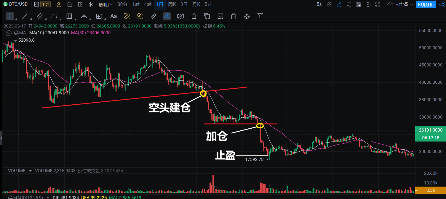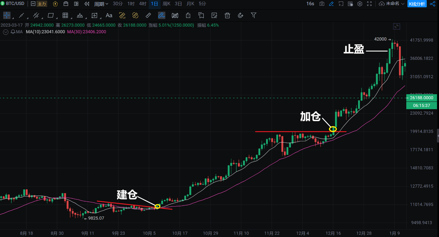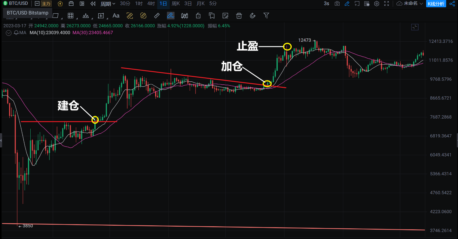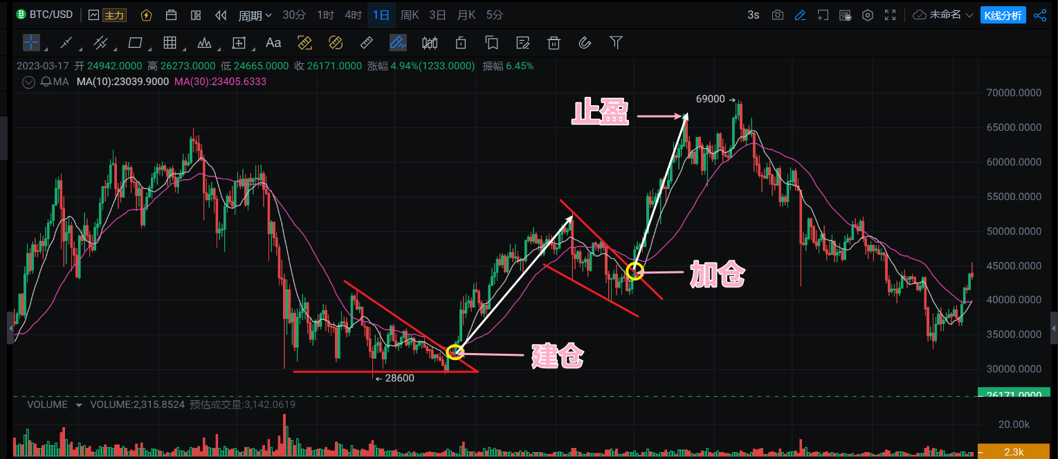 为了扩大利润,每次日线图形态突破都需要开立新单子,这操作之前叫做“加仓”,现在为了长期持仓而不提高合约单的成本价、强平价,所以这里我们需要使用“分仓”代替。